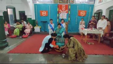 प्रिंसिपल को सम्मान: हेड बॉय शौर्य और हेड गर्ल दीक्षिता ने सर्वप्रथम प्रधानाचार्या ऊषा मित्तल के चरण धोकर उनका आशीर्वाद प्राप्त किया।